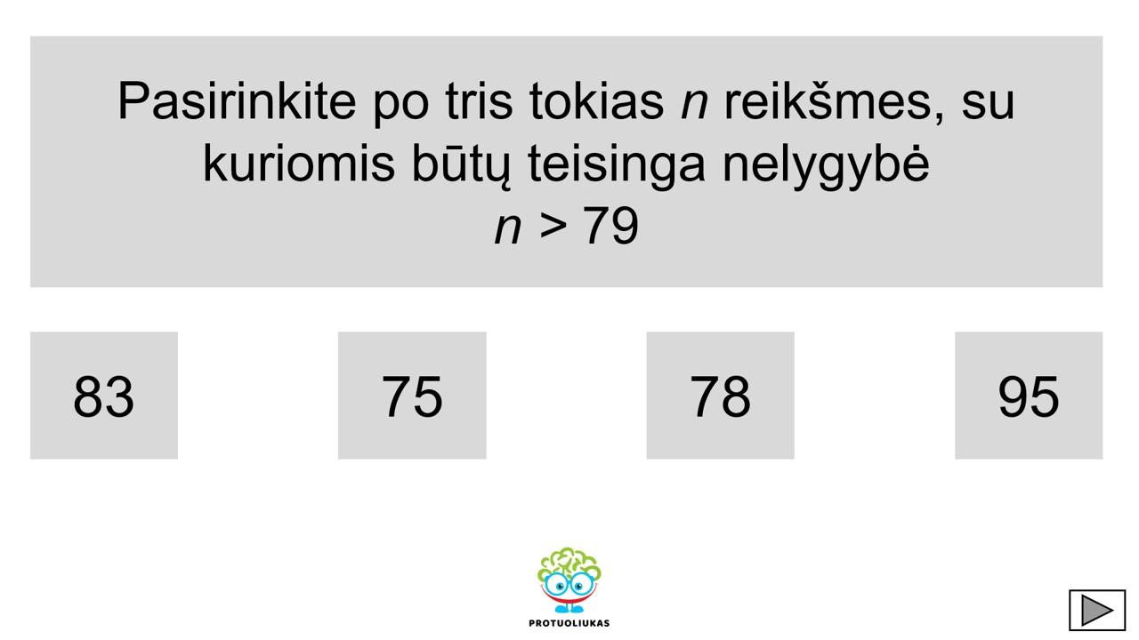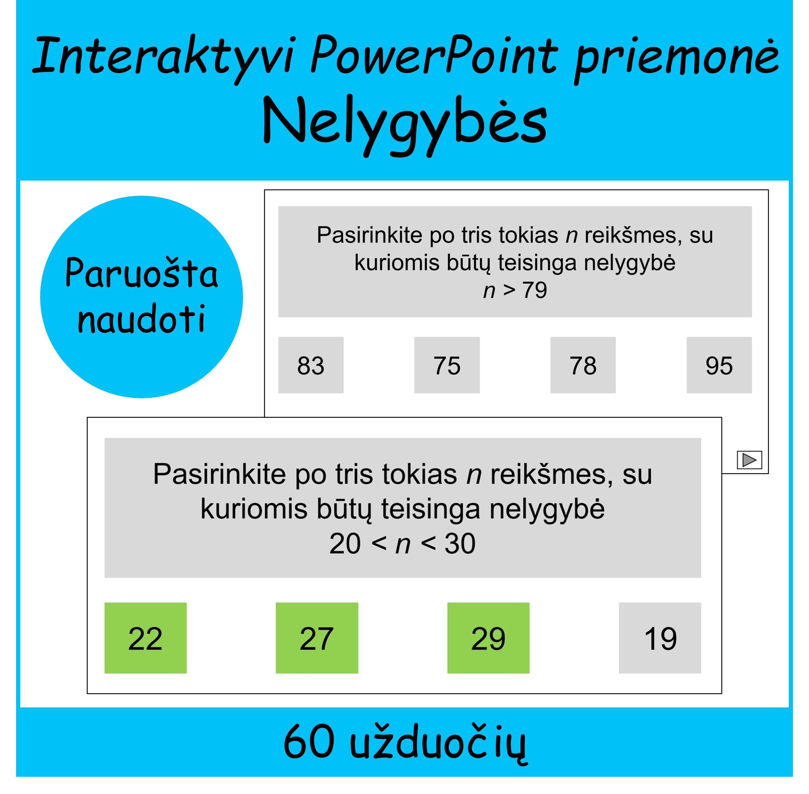 Interaktyvi priemonė skirta mokytis suprasti ir taikyti nelygybes, pasirenkant tinkamas nežinomojo reikšmes. Mokiniai ne tik mato nelygybę, bet ir praktiškai tikrina, kurie skaičiai ją tenkina.