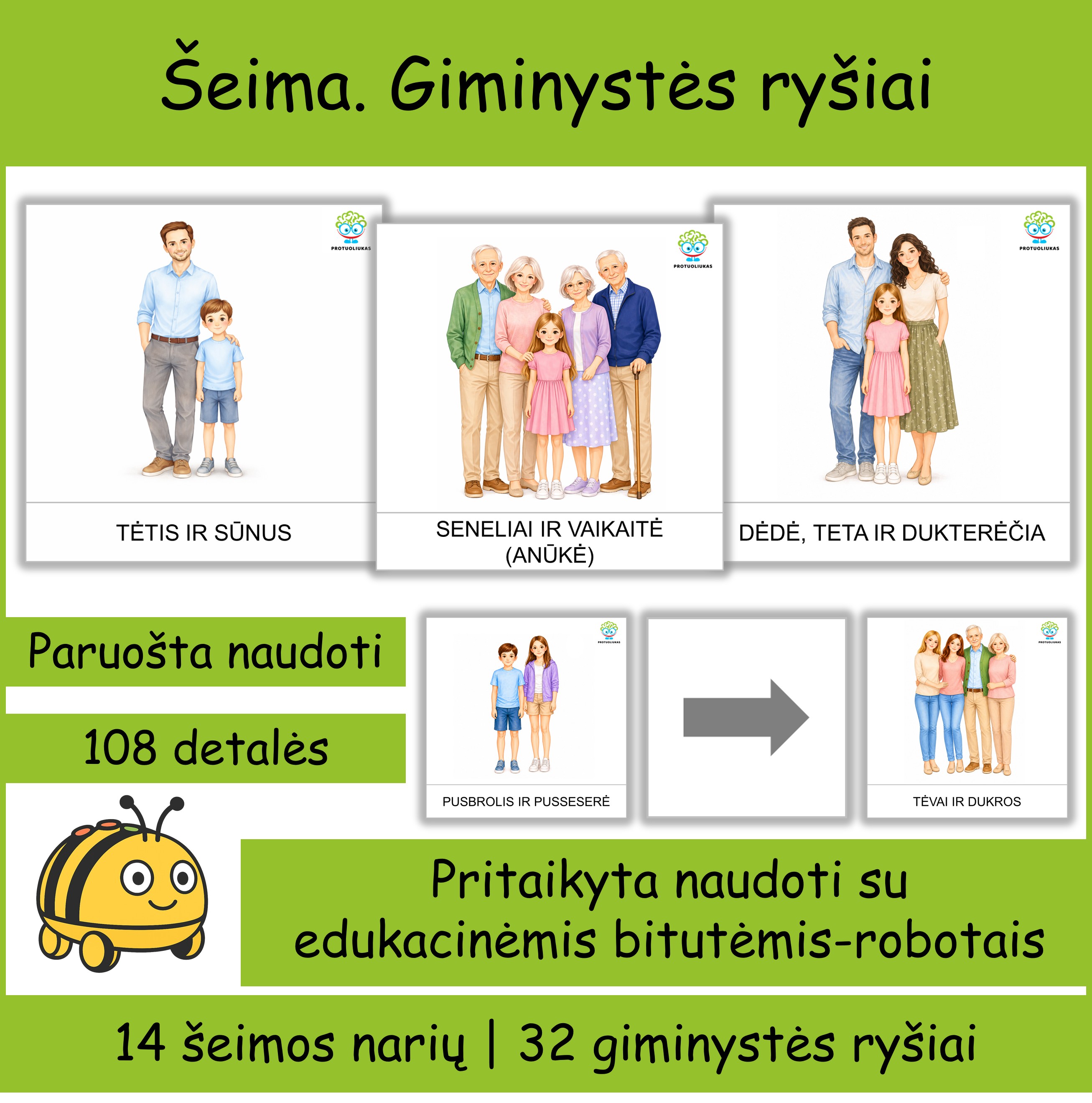 Edukacinė priemonė skirta mokytis atpažinti šeimos narius ir suprasti giminystės ryšius. Vaikai ne tik įvardina šeimos narius, bet ir mokosi, kaip jie susiję tarpusavyje.