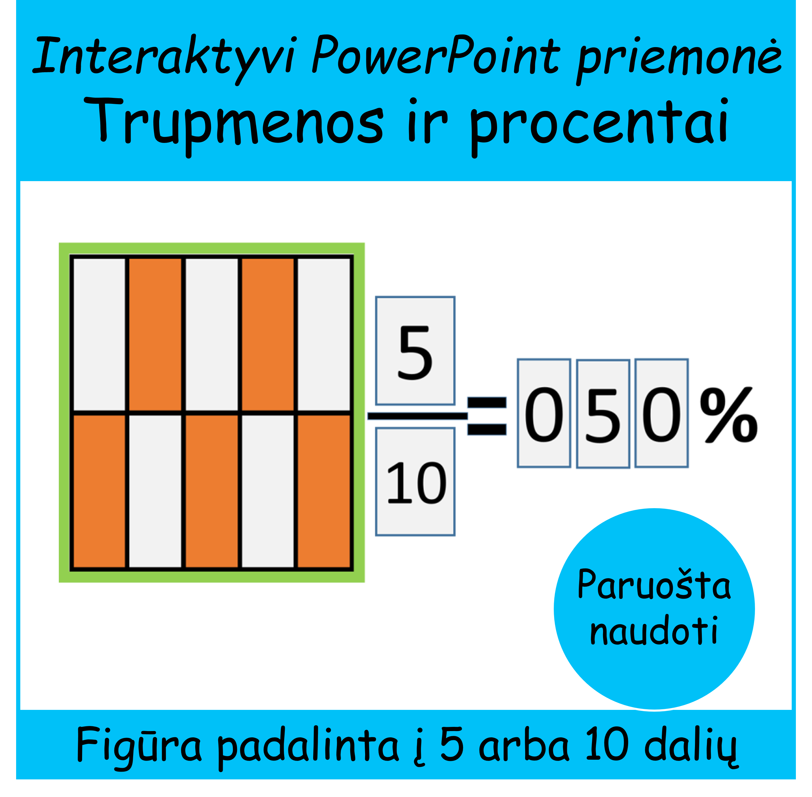 Ši interaktyvi PowerPoint priemonė padeda mokiniams mokytis trupmenų ir procentų praktiškai bei vizualiai. Mokiniai rankiniu būdu nuspalvina figūros dalis, o tada pelės paspaudimais pasirenka skaičius, kol randama teisinga trupmenos ir procento reikšmė.